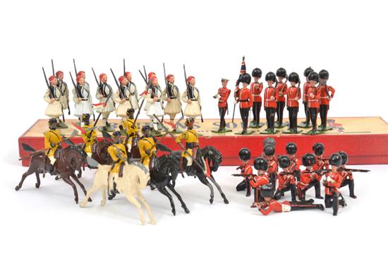 no.82 has 9 x figures; no.120 coldstream guards has 9 x figures; no.136 with 6 x horseback figures; and no.196 evzones royal guards including 5 x cream dressed Greek soldiers and 6 x white dressed Greek soldiers (F-E box F-VG) (4)