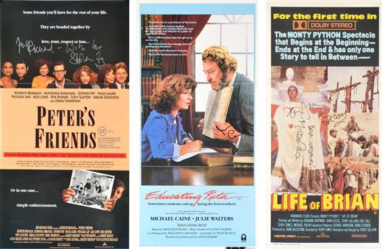 all Australian daybills including 'Life of Brian', Handmade Films, 1979, signed in black felt tip by John Cleese, Michael Palin and Eric Idle; 'Educating Rita', Columbia Pictures, 1983 signed by Michael Caine; and 'Peter's Friends', Film 4 International, signed by Stephen Fry and a copy of a photograph at time of signing (3)