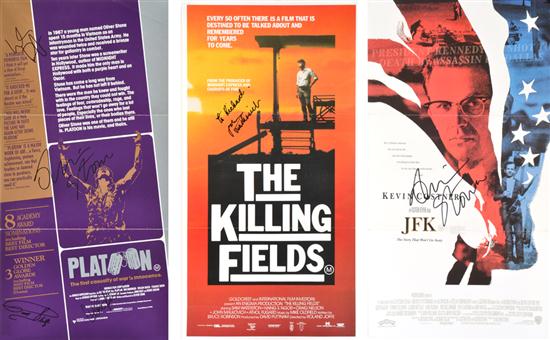 Orion Pictures, 1986, signed in black felt tip by Writer/Director Oliver Stone, Charlie Sheen, Willem Dafoe and a copy of a photograph at time of signing, and Percy Sledge; a poster for 'JFK', Warner Bros., 1990, signed by Oliver Stone; and an Australian daybill poster for 'The Killing Fields' signed by John Malkovich (3)
