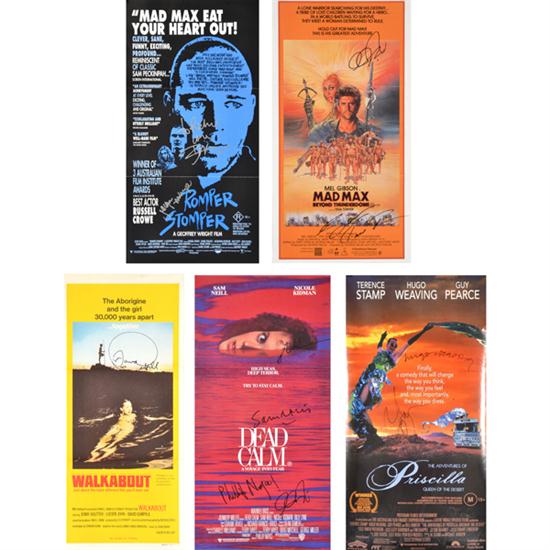 the majority signed on Australian daybill posters including Russell Crowe and a copy of a photograph at time of signing, and Jaqueline McKenzie ('Romper Stomper'); Tina Turner and a copy of a photograph at time of signing and George Miller ('Mad Max Beyond Thunderdome' ); Guy Pearce and a copy of a photograph at time of signing, and Hugo Weaving ('Priscilla Queen of the Desert'); Nicole Kidman and a copy of a photograph at time of signing, Sam Neill and Director Phillip Noyce ('Dead Calm'); Barry Humphries and Bruce Beresford ('The Adventures of Barry McKenzie') and a copy of a photograph just after signing; Russell Crowe and Danielle Spencer (The Crossing'); and a 'Wolverine' comic signed by Hugh Jackman; other signatures include Jack Thompson, Jacki Weaver and a copy of a photograph at time of signing, Bryan Brown (2), David Gulpilil (2) and Charles Tingwell (a lot)