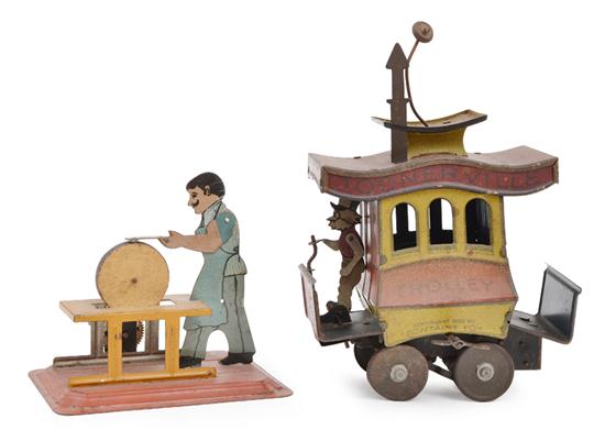 German, circa 1922, trolley chugs up and down when rolling forward, permanent key, some scratching to surface and metal tarnish, unboxed; and Arnold Grinder, German, flat tin figure grinds knife on rotating wheel when wound, permanent key, some scratches and metal tarnish, unboxed (G) (2)