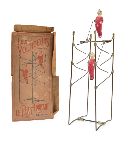 France, Paris, Le Plus Amusant, composite figures and metal frame with original box, acrobats in hand painted magenta unitards, chips to composite (F-G box P-F)
