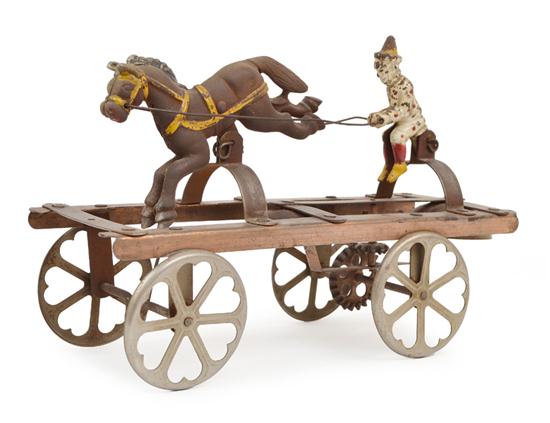 solid metal figures, hand painted clown and horse reins and mane, beautiful heart spoked wheels with two chimes to base that ring when wheels turn, some paint loss and metal tarnish, unboxed (F-G)