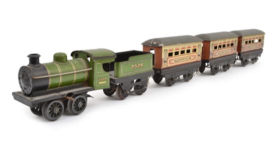 U.K., green livery loco and tender with gold and red 2526 to sides, key present, pullman carriages lithographed cream, brown, black, red and brass coloured, some scratches and metal tarnish, unboxed (G-VG) (5)