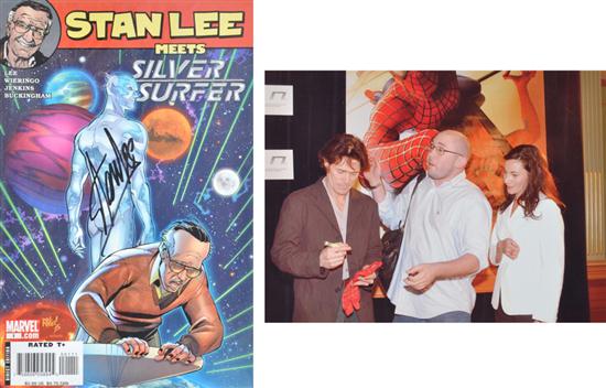 novelty glove signed by all three in black felt pen, in display frame; and a comic 'Stan Lee meets Silver Surfer' signed by Stan Lee (2)