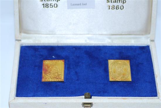 TWO 18CT GOLD REPLICAS OF THE FIRST VICTORIA AND QUEENSLAND POSTAGE STAMPS
