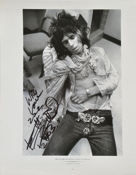 machine print photograph by Annie Liebovitz signed and inscribed in black felt tip 'With love zzz Keith Richards 2003'