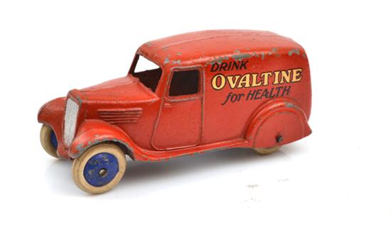 type 2, red body, black and gold transfers to sides 'Drink Ovaltine For Health', smooth blue hubs, white tyres, no fatigue, some paint loss to extremities (G)
