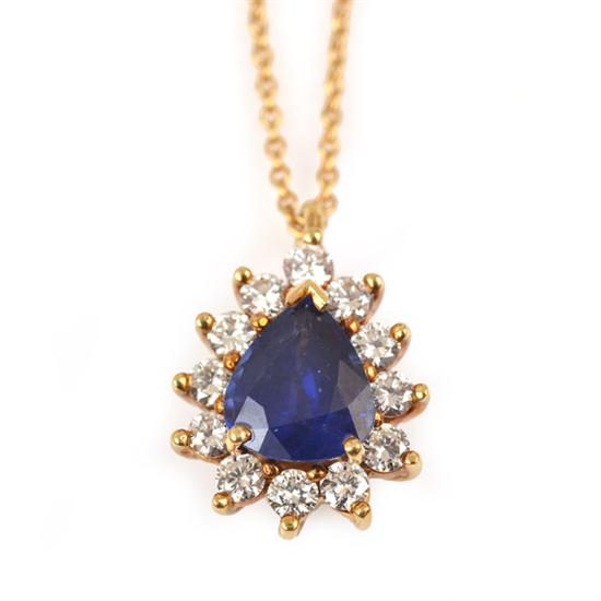 The pear cut sapphire weighing 1.60cts surrounded by a border of round brililant cut diamonds, suspended on a fine trace chain in 18ct gold.