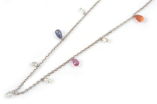 The fine trace chain suspending briolette cut multi-coloured sapphires and diamonds, in 14ct white gold, total length 460mm.