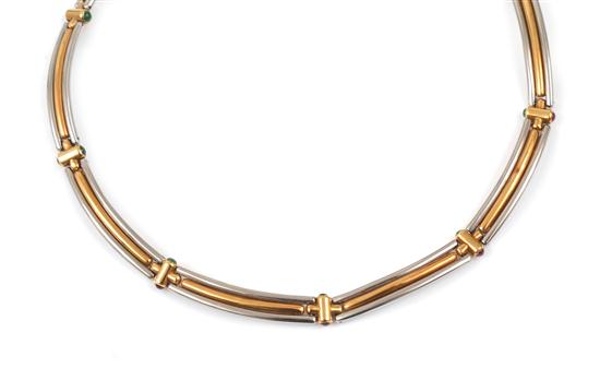 Of sectional design, each elongated curved and reeded panel spaced by a tubular link with cabochon cut emerald and tourmaline terminals, in two tone 18ct gold, total length 340mm, boxed.