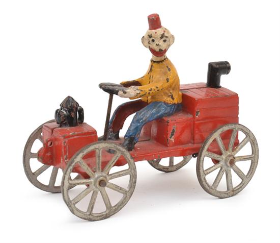 circa early 1900s, red painted cast iron automobile with silver painted wheels, Happy driver with blue trousers and yellow jacket, red fez , as buggy rolls along the hooligan's head turns to the side (VG)