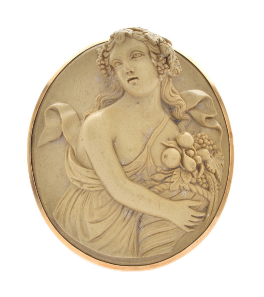 The oval lava cameo depicting a finely detailed maiden, to a 9ct gold frame, signed Abbondanza.