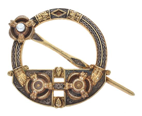 The finely detailed embossed pin with a single natural pearl, in silver gilt, marked West & Son, College Green, Dublin, with Victorian date stamp 17 December, 1849.