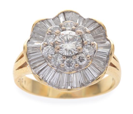 Centred with a cluster of round brilliant cut diamonds, within an undulating border of tapered baguette cut diamonds, in 18ct gold, independent valuation available, ring size T-U.