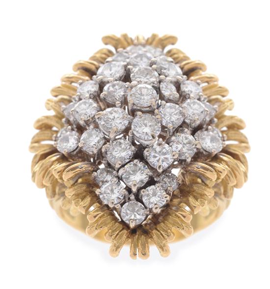 The diamond shaped cluster of claw set round brilliant cut diamonds totalling 2.60cts, within an abstract textured border, in 18ct gold, ring size S-T.