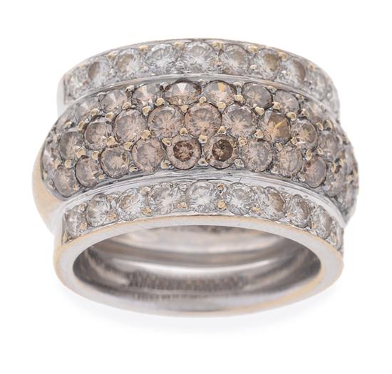 The wide band with a central domed triple row of cognac diamonds, bordered by white diamonds, all pave set, in 18ct white gold, ring size M-N.