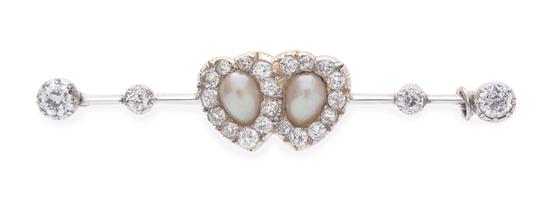 The double heart pearl and diamond cluster centred on a diamond set bar in 14ct white gold.