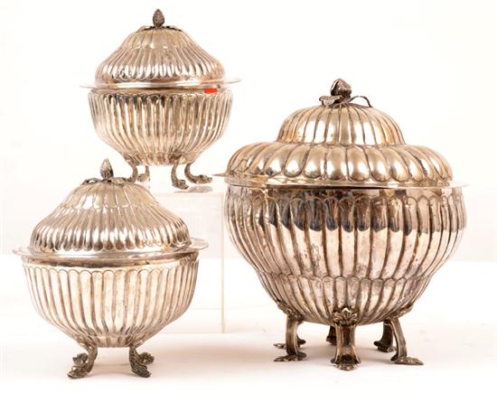 A SET OF THREE SILVER PLATED FOOTED TUREENS