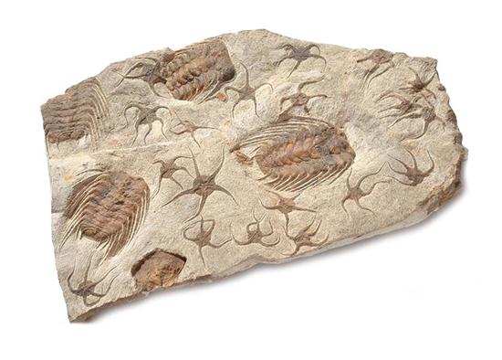 TRIOBITE SELENOPELTIS AND OPHUROID STARFISH, ORDOVICIAN (APPROXIMATELY 450 MILLION YEARS OLD), ERFOUD, MOROCCO, 63CM X 43CM X 5CM