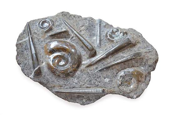 GONIATITE AND ORTHOCERAS, DEVONIAN (APPROXIMATELY 400 MILLION YEARS OLD), ERFOUD, MOROCCO, 70CM X 46CM X 6CM