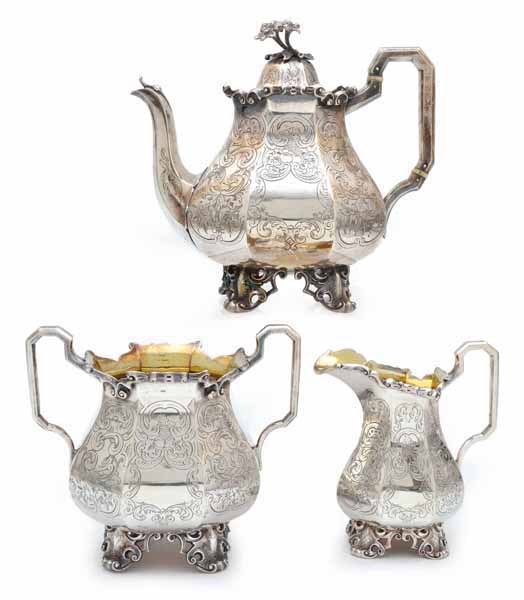 Comprising a teapot, sugar vessel and creamer, faceted body, 1506grs total weight, the teapot 22cm high.