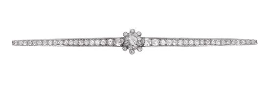 Centred with a floral style cluster of old European cut diamonds on an elongated diamond set bar, in 9ct gold.