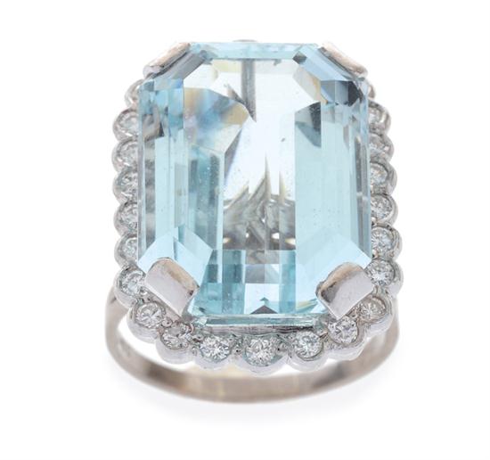 Of rectangular cluster design, centred with a step cut aquamarine weighing 21.5cts, within a border of round brilliant cut diamonds, in 18ct white gold, ring size R-S.