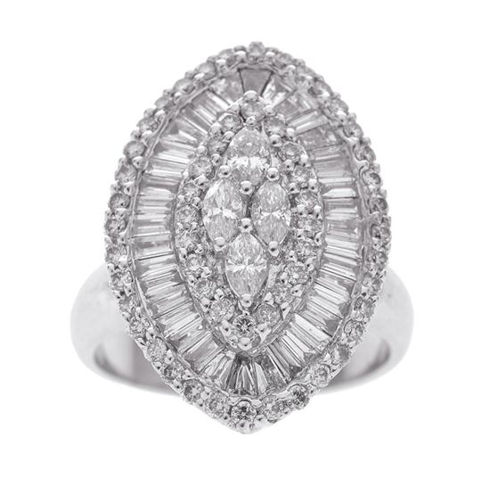 The marquise shaped plaque set with marquise, round brilliant and baguette cut diamonds, in 18ct white gold, ring size N-O.
