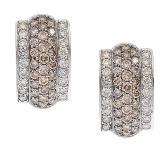 The wide hoops with a central domed triple row of cognac diamonds, bordered by white diamonds, all pave set, to clip fittings, in 18ct white gold.