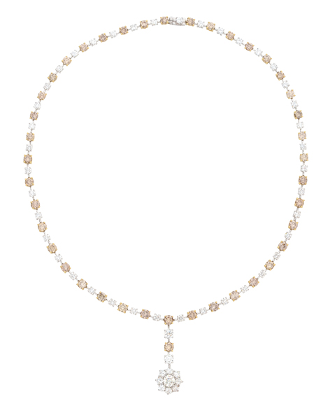 Comprising alternating claw set champagne and white round brilliant cut diamonds, suspending a floral cluster style drop, altogether totalling 22.33cts, in two tone 18ct gold, total length 455mm, independent valuation available.