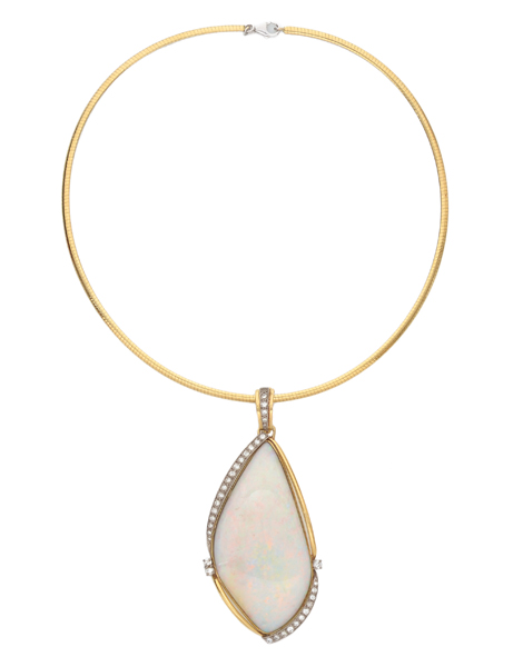 Of modern abstract design, the large solid white opal mounted within a diamond set frame, and suspended on an omega collar, in two tone 18ct gold.