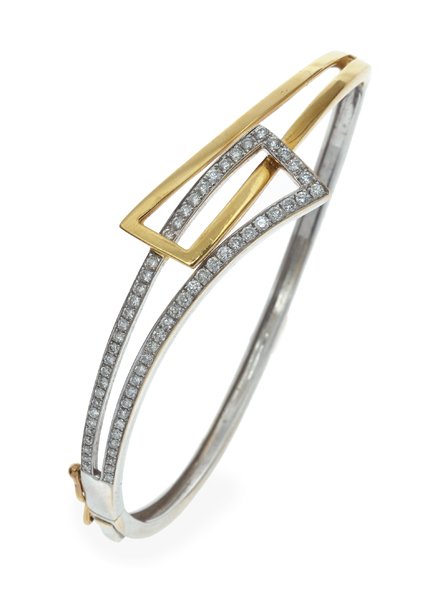 Of modern design, the hinged bangle with interlocking tapering rectangular panels, one diamond set totalling 0.76cts, in two tone 18ct gold.
