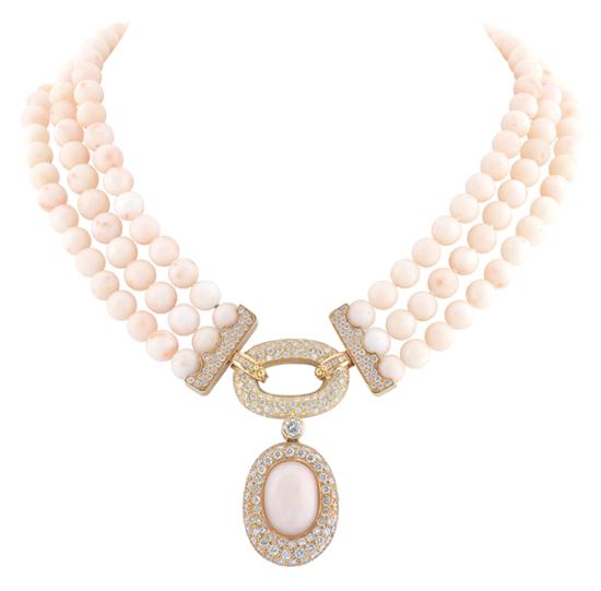 Comprising a triple strand of angelskin coral beads suspending a coral and diamond set pendant/clasp, in 18ct gold, total length 390mm.