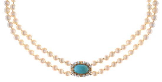 Comprising round pearls of creamy hues, measuring 7.25mm to 8.25mm to a turquoise and seed pearl cluster clasp, in 18ct gold, total length 700mm.