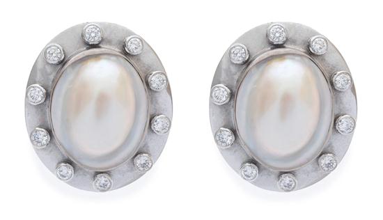 Each earring centred with an oval mabe pearl within in a wide surround set with ten round brilliant cut diamonds altogether totalling 1.80cts, to clip fittings, in 18ct white gold.