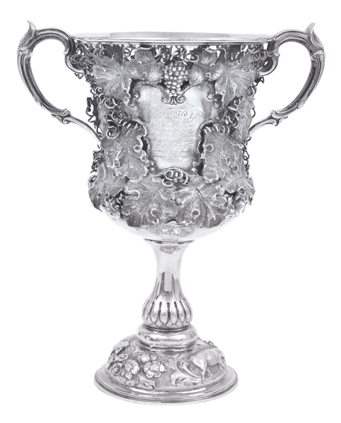 The two handled cup with an ogee body, bearing the inscription 'Presented to / Louis Kitz Esqr / by the / wine growers of the Geelong District / in token of their esteem / for his laudable exertions in promoting the / colonial wine trade / Geelong Jany. 24th 1862,' richly embossed with a pastoral scene, the two sectional collar comprising chased and stippled overlapping vine leaves and graves, centred by a cartouche bearing an identical inscription to the body, the cup 780grs. total weight of silver, 28cm high; the collar 290grs. total weight, each section measuring 11cm wide x 13cm high (irregular).