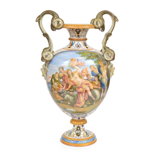 A GINORI TIN GLAZED EARTHENWARE TWO HANDLED VASE, IN THE URBINO STYLE, LATE 19TH CENTURY