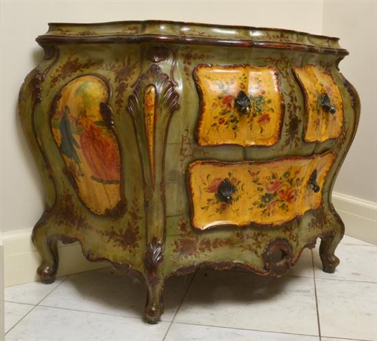 A VENETIAN STYLE POLYCHROME BOMBE COMMODE