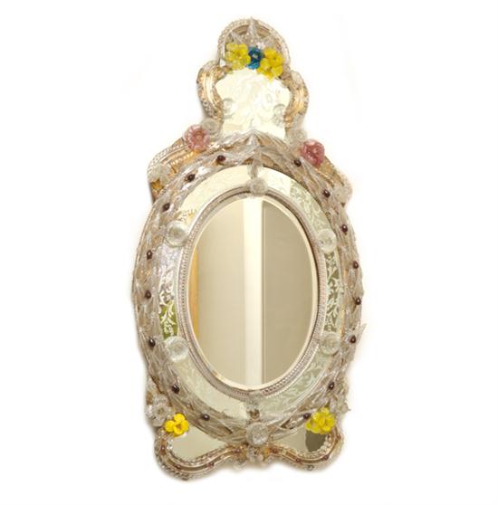 *** WITHDRAWN *** A VENETIAN GLASS MIRROR, WITH ETCHED PANELS AND COLOURED GLASS APPLICATIONS ,120CM HIGH