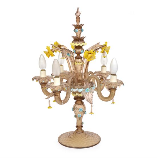 AN ELABORATE FIVE BRANCH VENETIAN GLASS LAMP, IN CLEAR AND COLOURED GLASS
