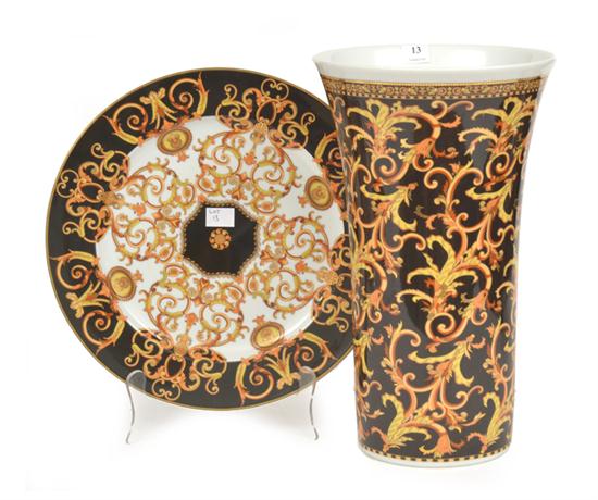 A 'BAROCCO' PATTERN PORCELAIN VASE AND DISH BY ROSENTHAL FOR VERSACE