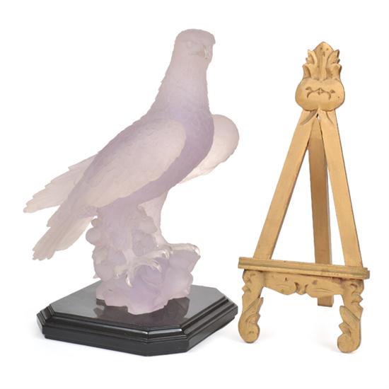 A RESIN MODEL OF A FLACON AND A PAINTED WOODEN MINIATURE EASEL