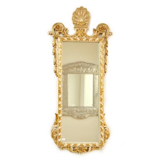 A PAINTED AND GILT WOOD FRAMED RECTANGULAR WALL MIRROR WITH A SHELL CREST