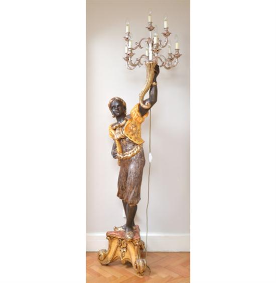 A POLYCHROME AND GILT WOOD BLACKAMOOR LAMP STAND