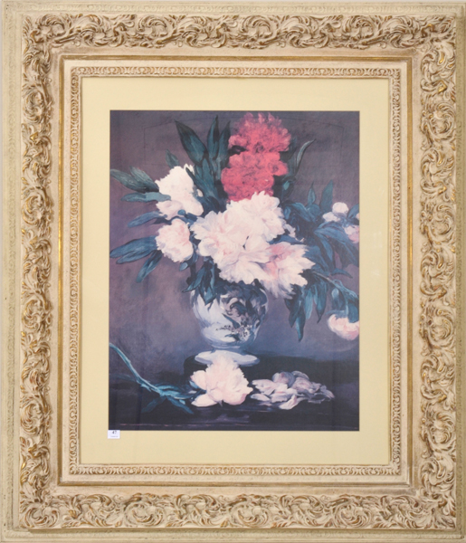A DECORATIVE PRINT DEPICTING A STILL LIFE IN AN ORNATE FRAME