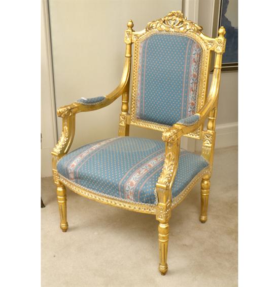 A PAIR OF LOUIS XVI STYLE GILT WOOD ARMCHAIRS