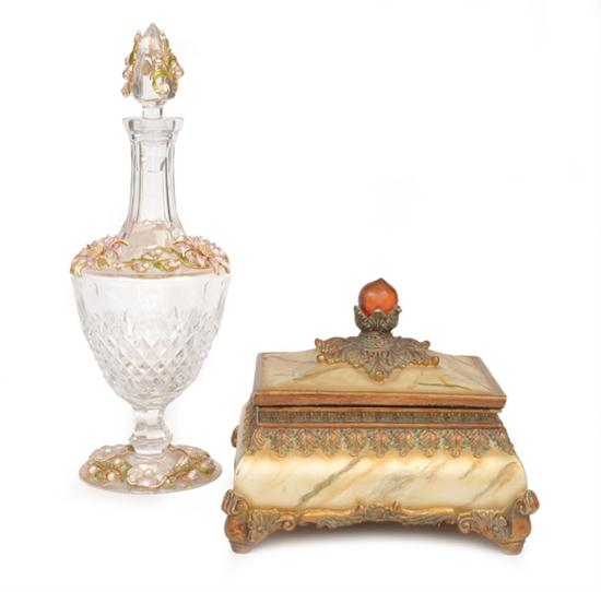 A CUT CRYSTAL DECANTER WITH FOLIATE APPLIQUES, TOGETHER WITH A PAINTED COMPOSITE JEWELLERY BOX