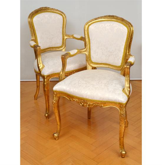 A PAIR OF LOUIS XV STYLE GILT WOOD FRAMED FAUTEUILLES