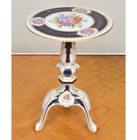 A CONTINENTAL HAND PAINTED AND GILT TRIPOD BASED OCCASIONAL TABLE
